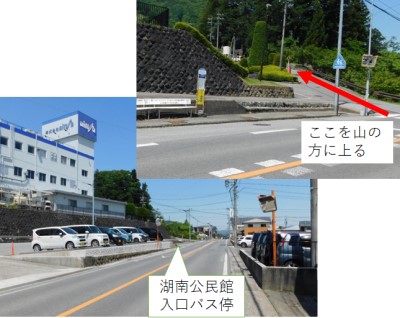バス停「湖南公民館入口」、株式会社nittoh 右側の細い道路をを上ります。